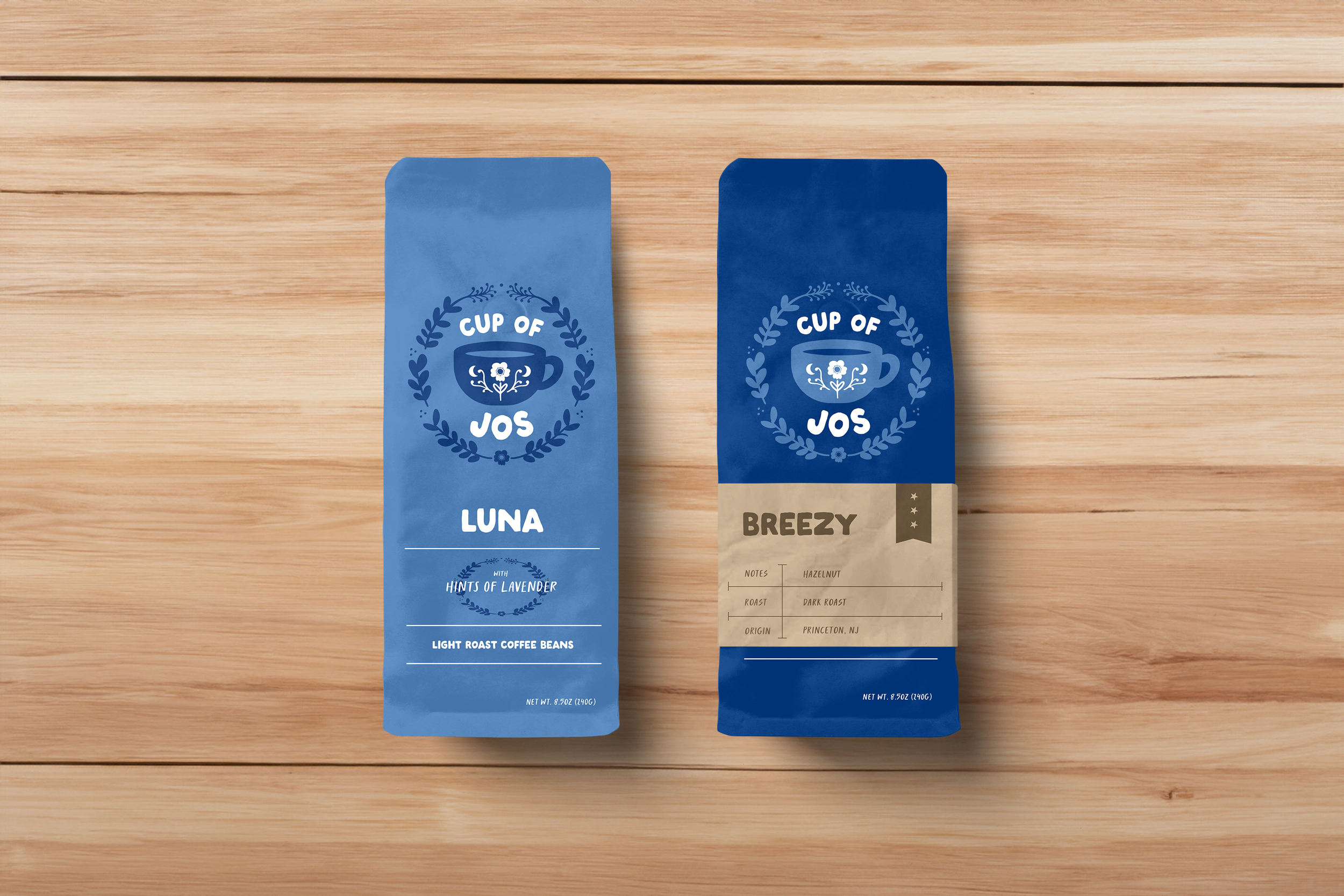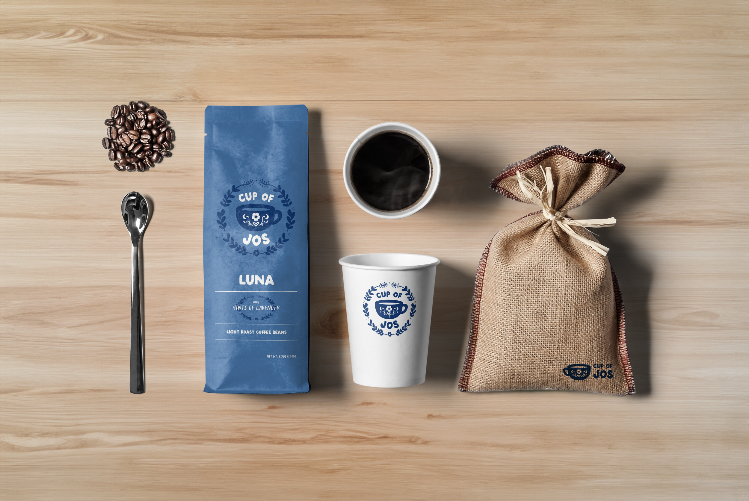 "Cup of Jos" is a branding and packaging project inspired by the @cupofjos Instagram account, transforming into a vibrant coffee shop in Princeton, NJ. Under the ownership of Josie Brothers, the brand draws its essence from her personal passions – a love for the moon, her dog Luna, the beach, the charm of New Jersey, and the beauty of flowers.