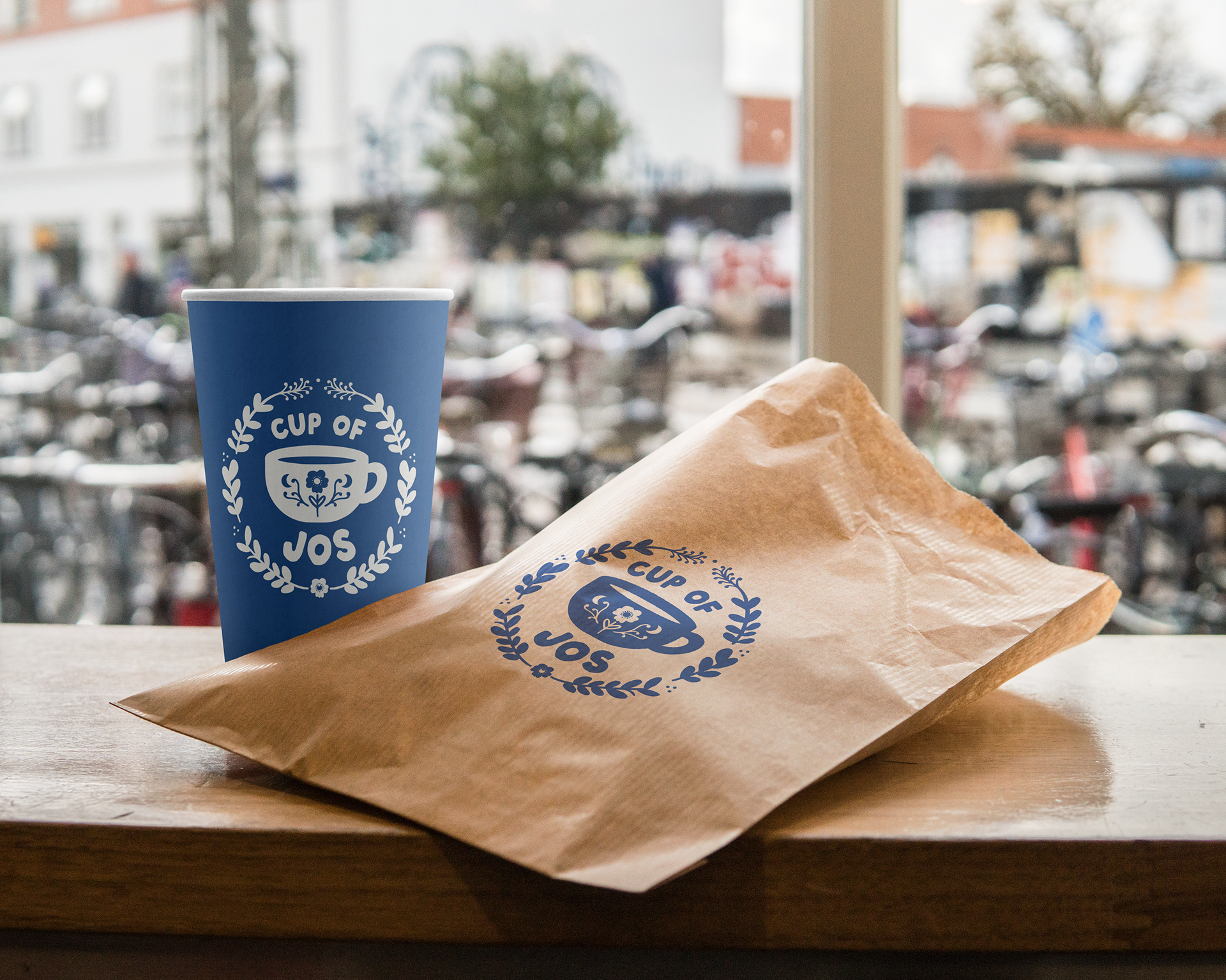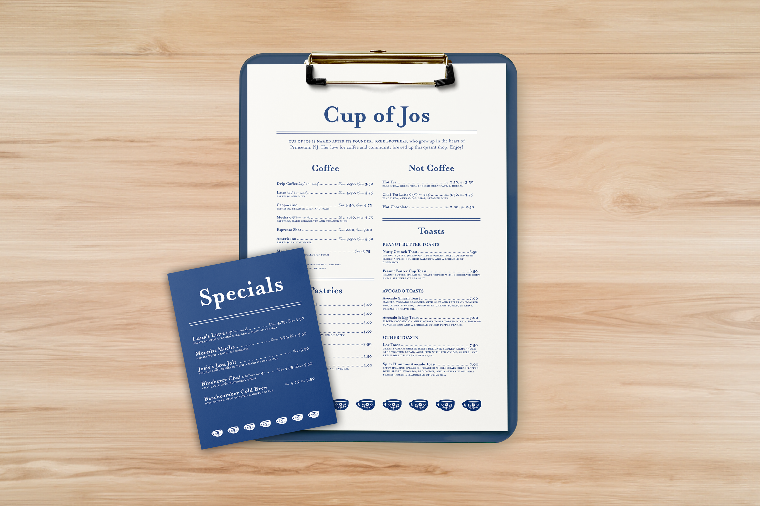The colors of Cup of Jos are modeled after blue and white china dishware and toile. These floral patterns are favorites of Josie’s and were requested to be in the branding of the shop.