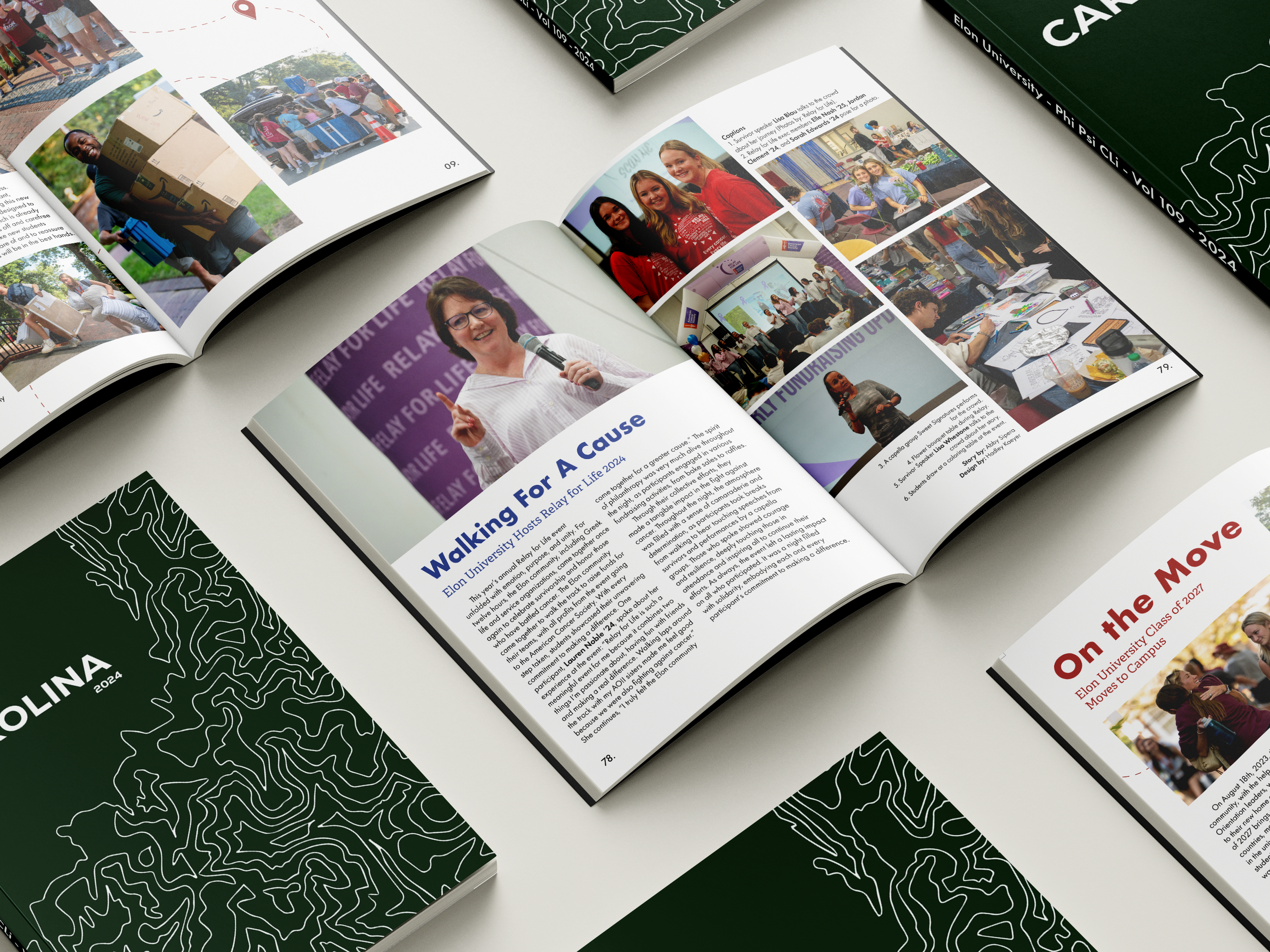 This year's book theme was “Carolina”, focusing on the community beyond Elon’s campus. Design elements revolved around maps, map iconography, and local flora and fauna.