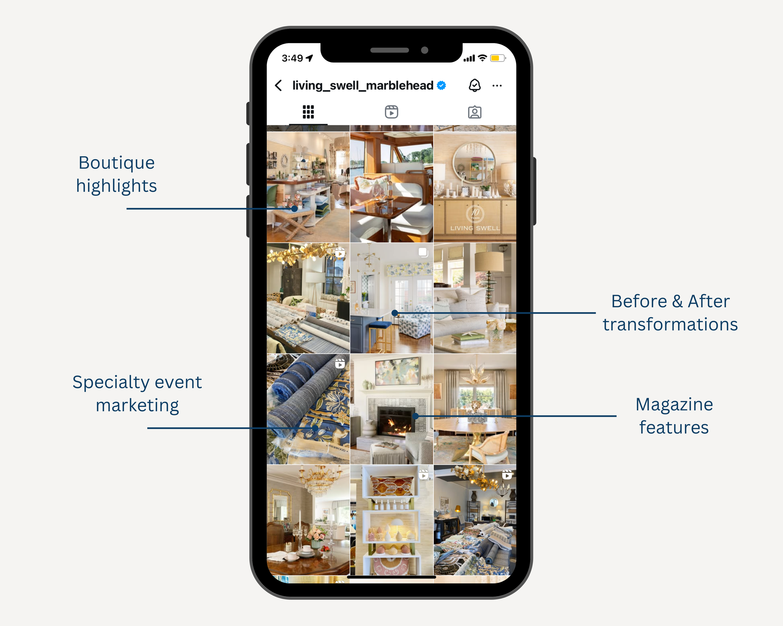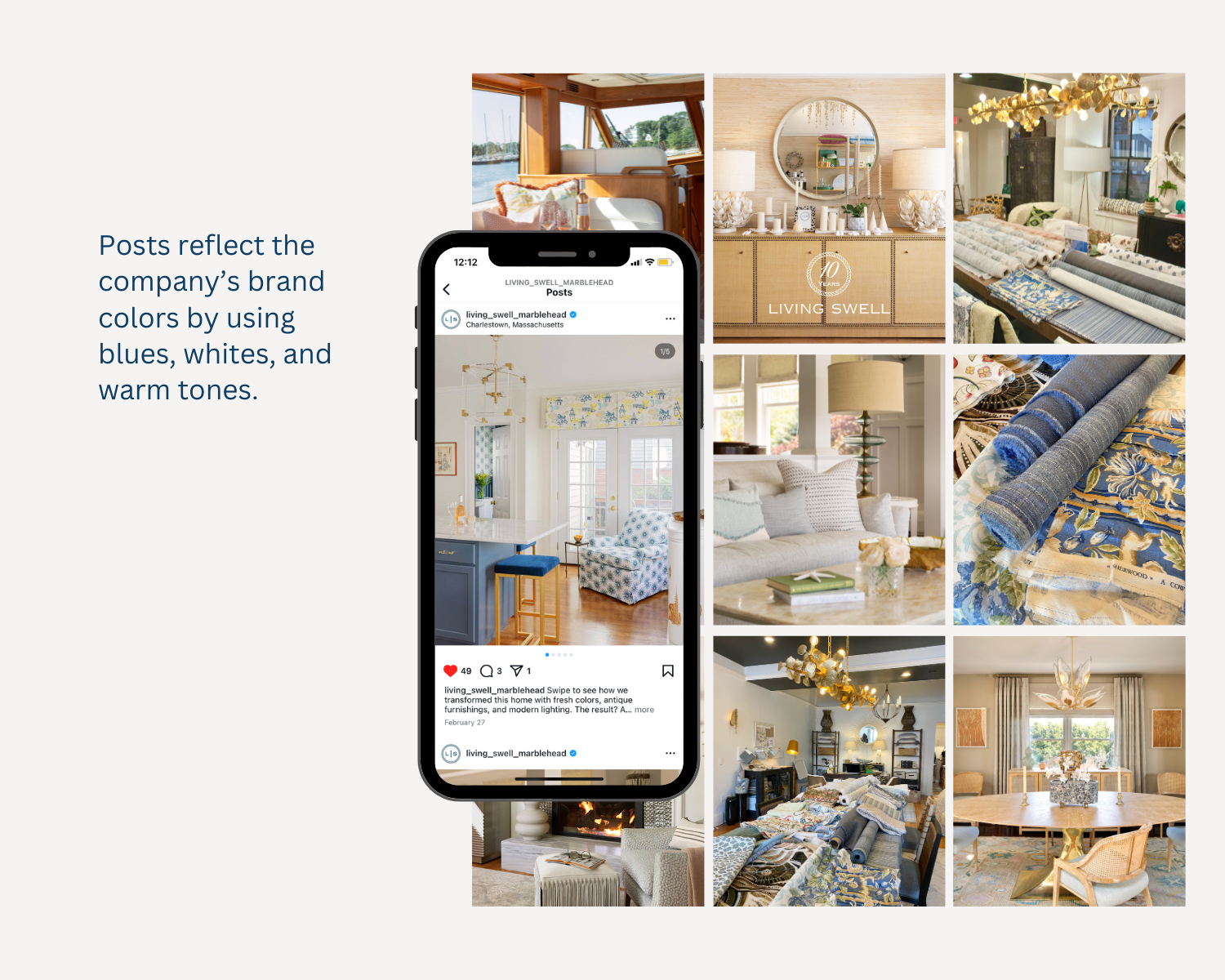 Living Swell, a boutique and interior design service in Marblehead, MA, wanted to strengthen engagement and increase visibility for their boutique. Through thoughtful content planning, I create posts, stories, and reels that highlight their products and connect with their audience. Beyond social, I design marketing materials—including magazine ads, logos, and more—and capture in-store photography and videography to bring their brand vision to life across all touchpoints.